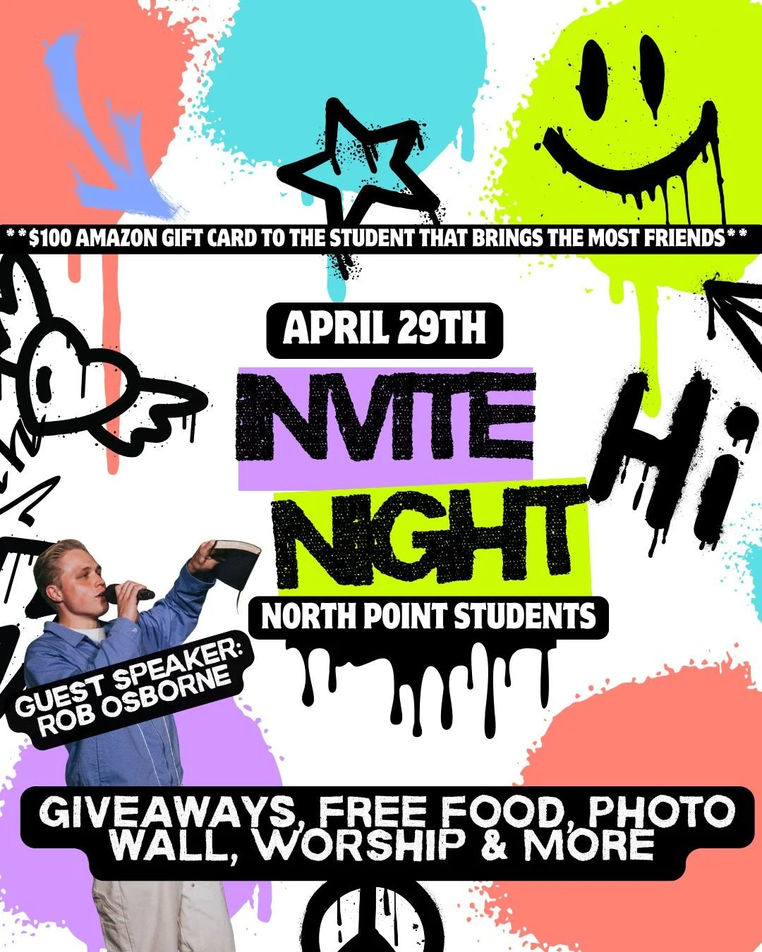 Join us Wednesday April 29th! Giveaways, free food, photo wall, worship and more!